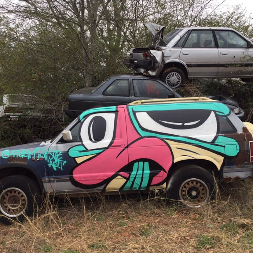 I spray painted this 4x4 at a place just north of Atlanta at a place called Schoolbus Graveyard.An artist friend of mine made friends with the owner of a junkyard and he started letting people come by and paint buses/cars.I painted there a few times and it was always a good time & a great spot to get some spraypainting in.