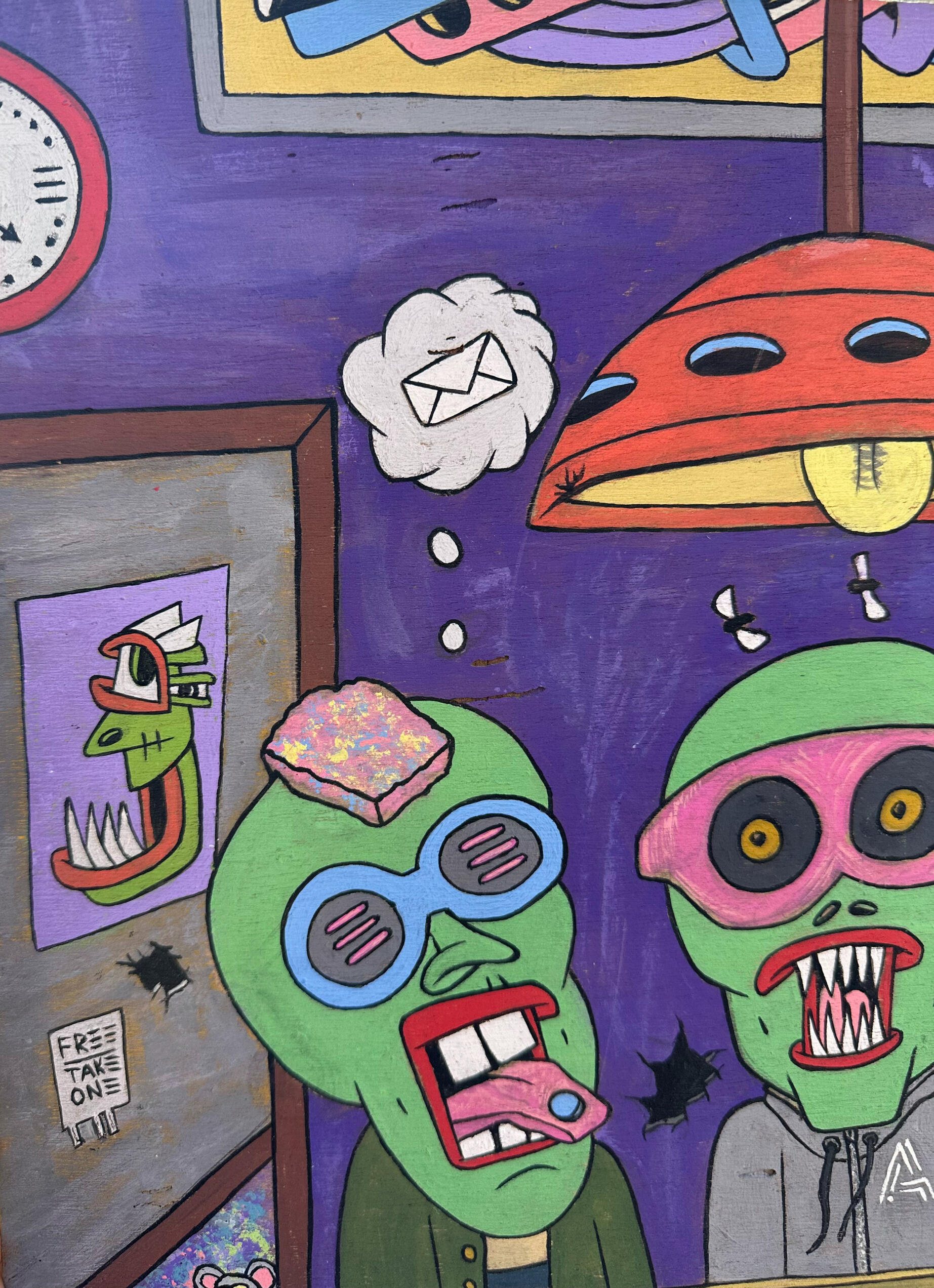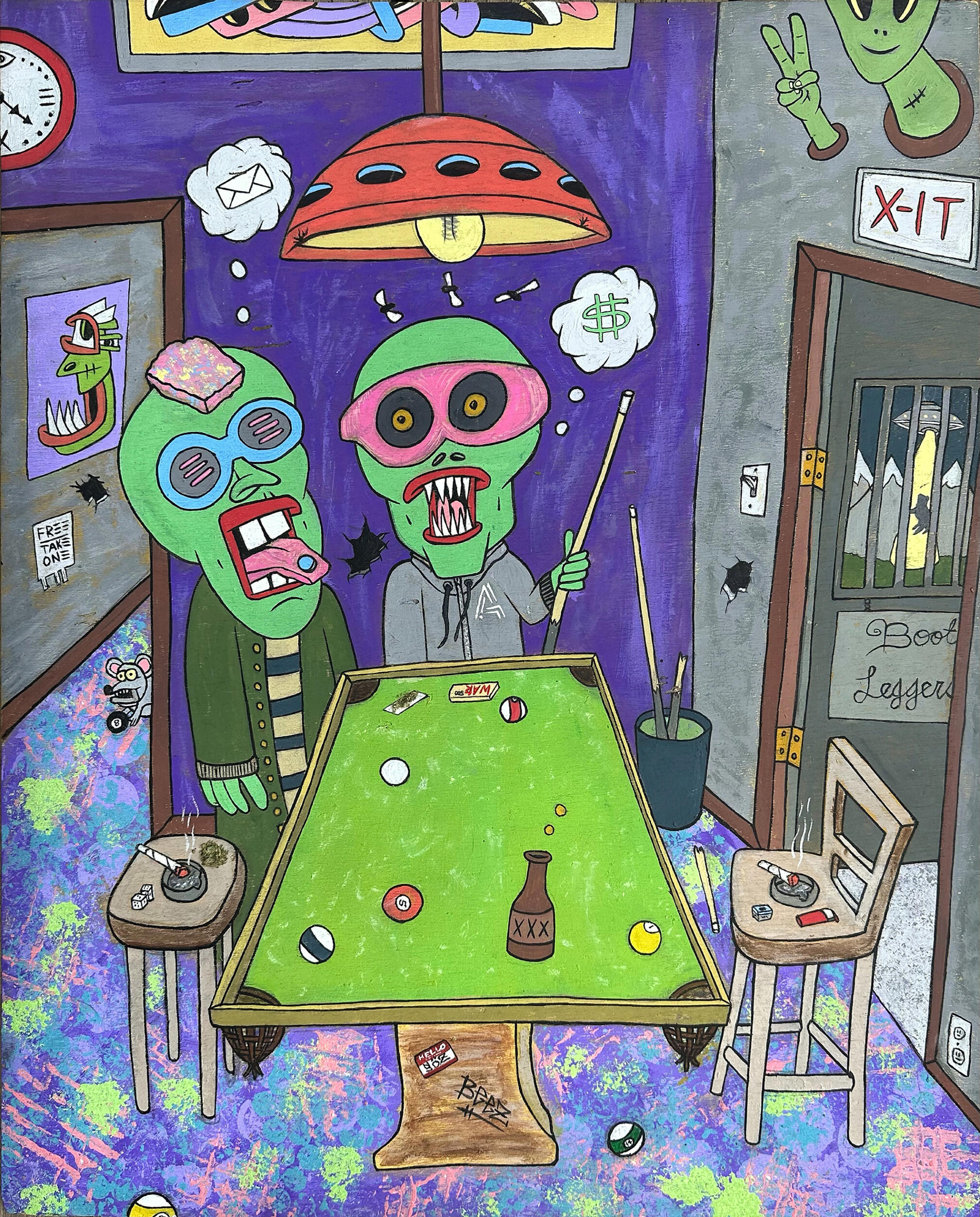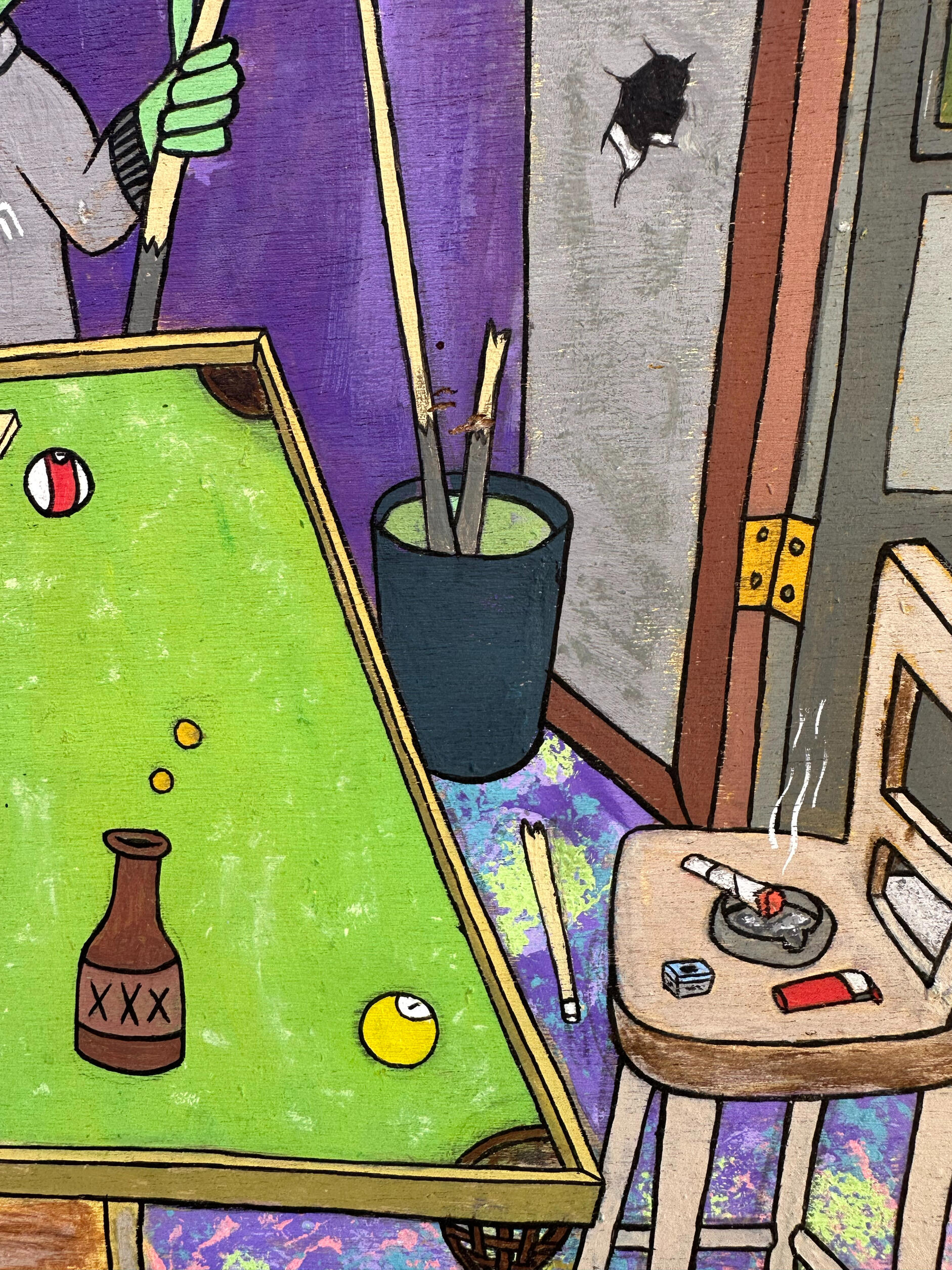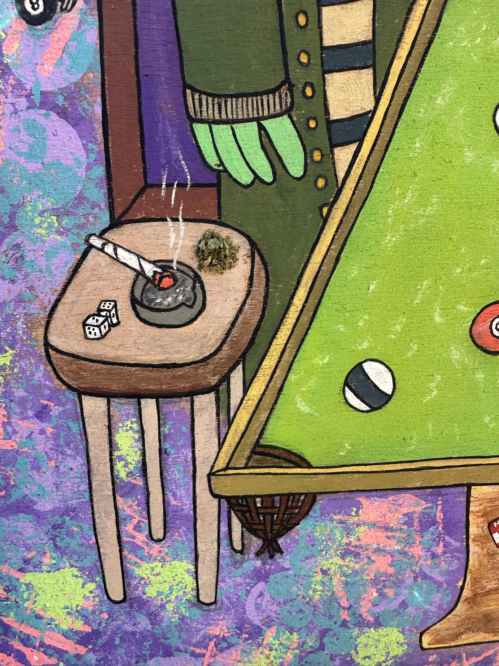 Schemes being plotted at a seedy bar in the mountains in the early hours of the morning.Acrylic paint & homegrown herbs on woodThis piece was made for an artist collective called Artillity. Each artist chose an NFT owned by punk2070 to recreate in their style.I chose XCOPY grifters and to push myself to create a full pool hall scene with lots of hidden details and my artwork on the walls.