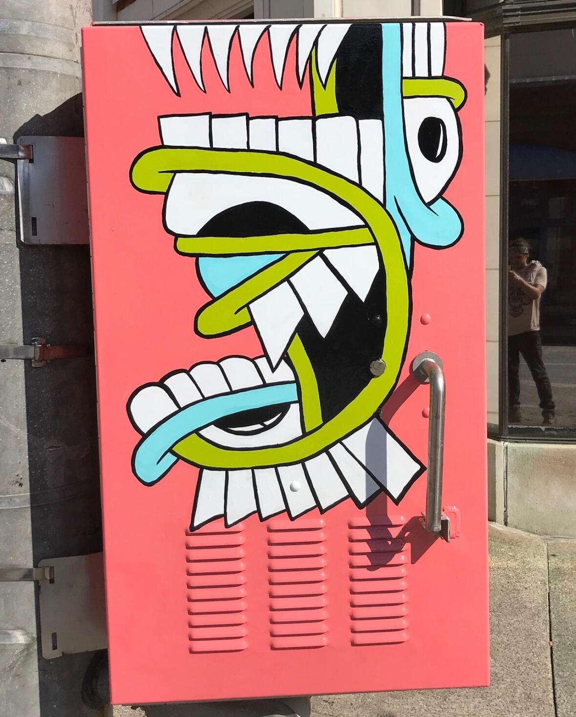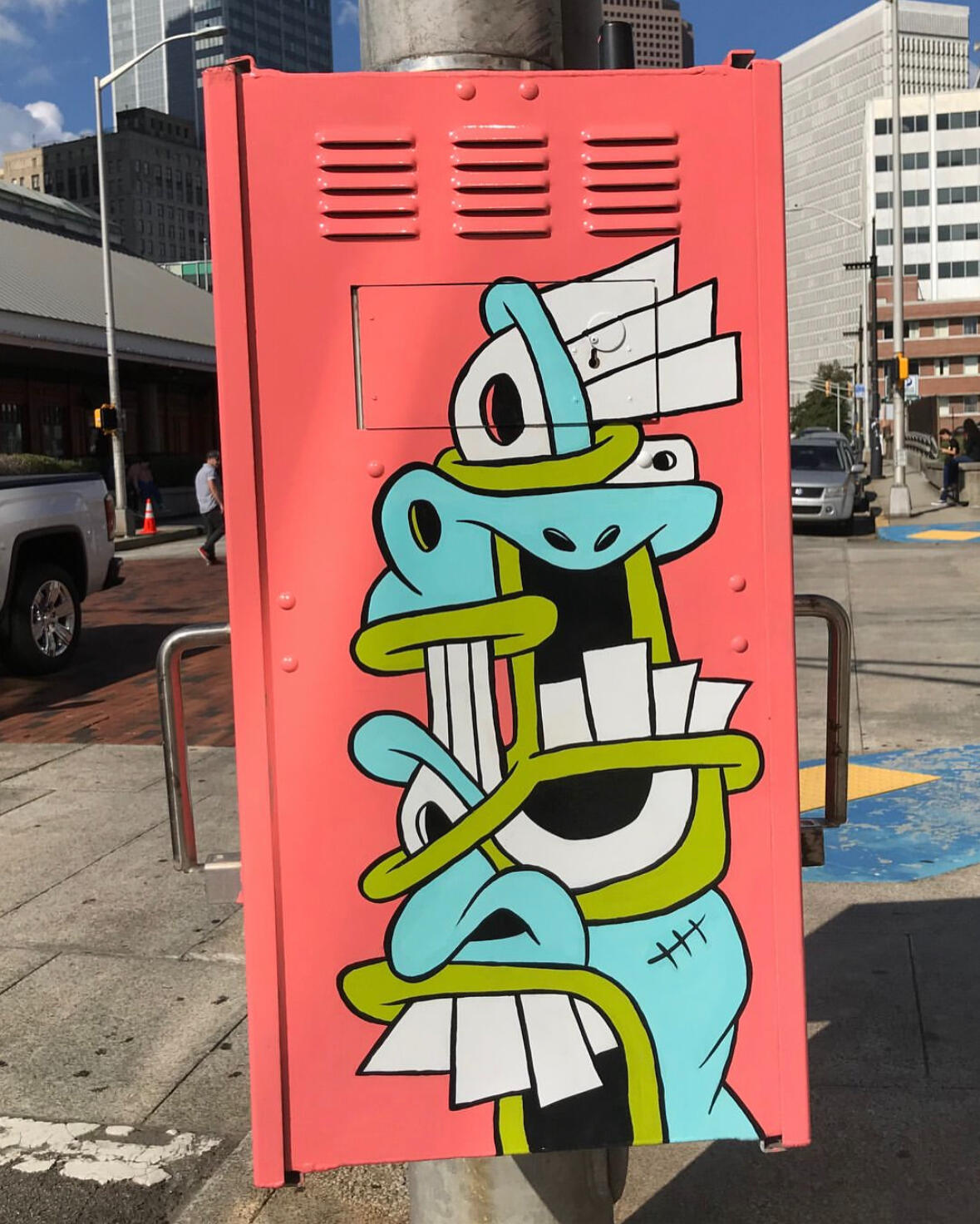 Enamel on metal utility boxThis piece was commissioned by City of Atlanta in 2017.My wife & I spent nights and weekend at Underground Atlanta over a few months to paint this piece. It was such a great time & we had alot of interesting experiences.