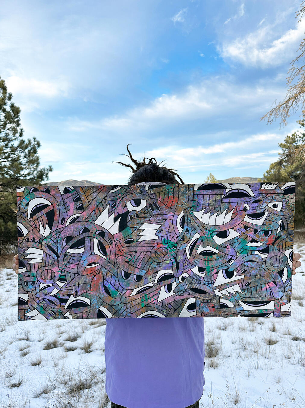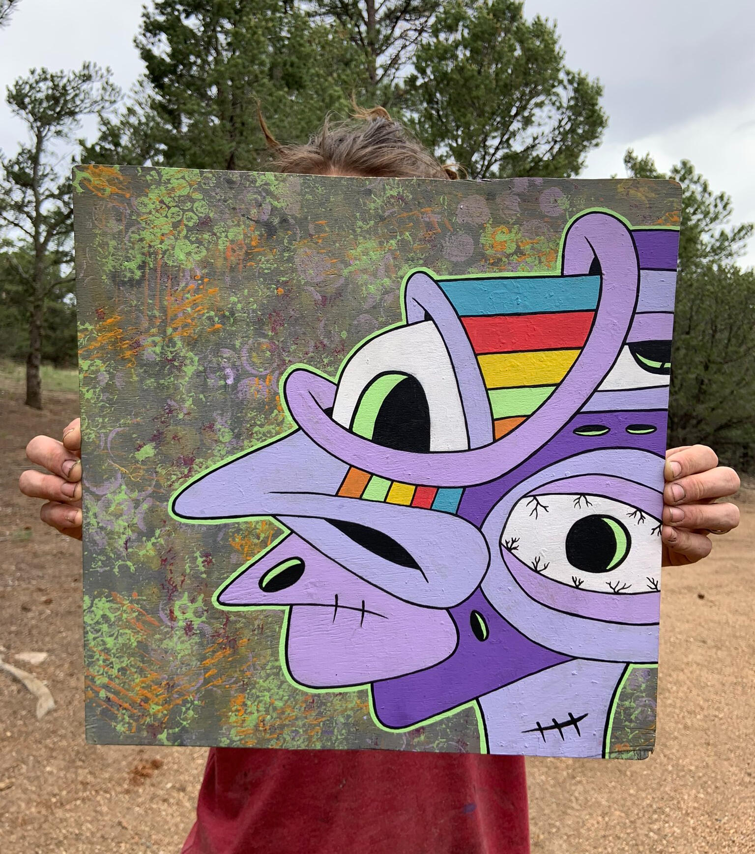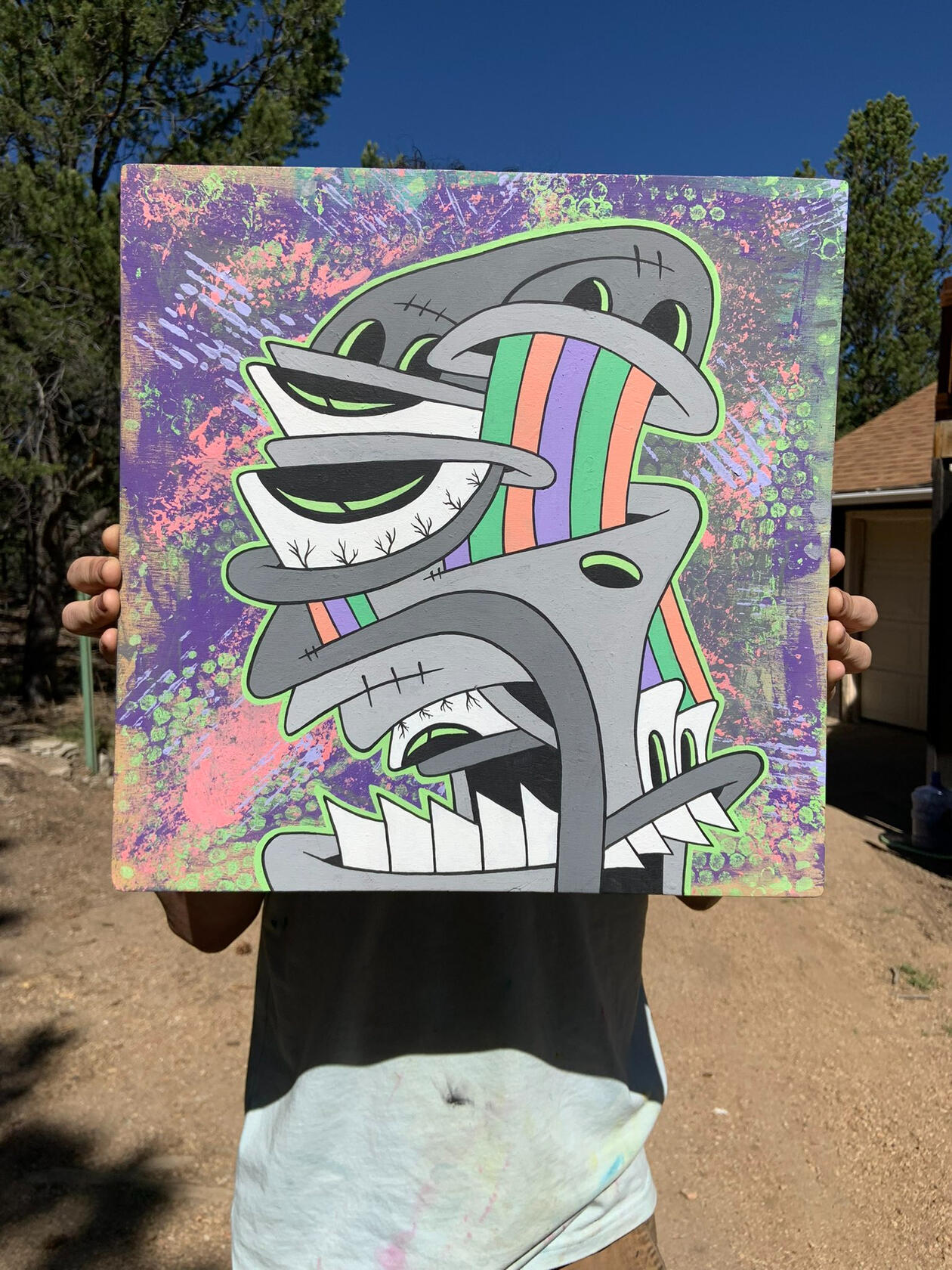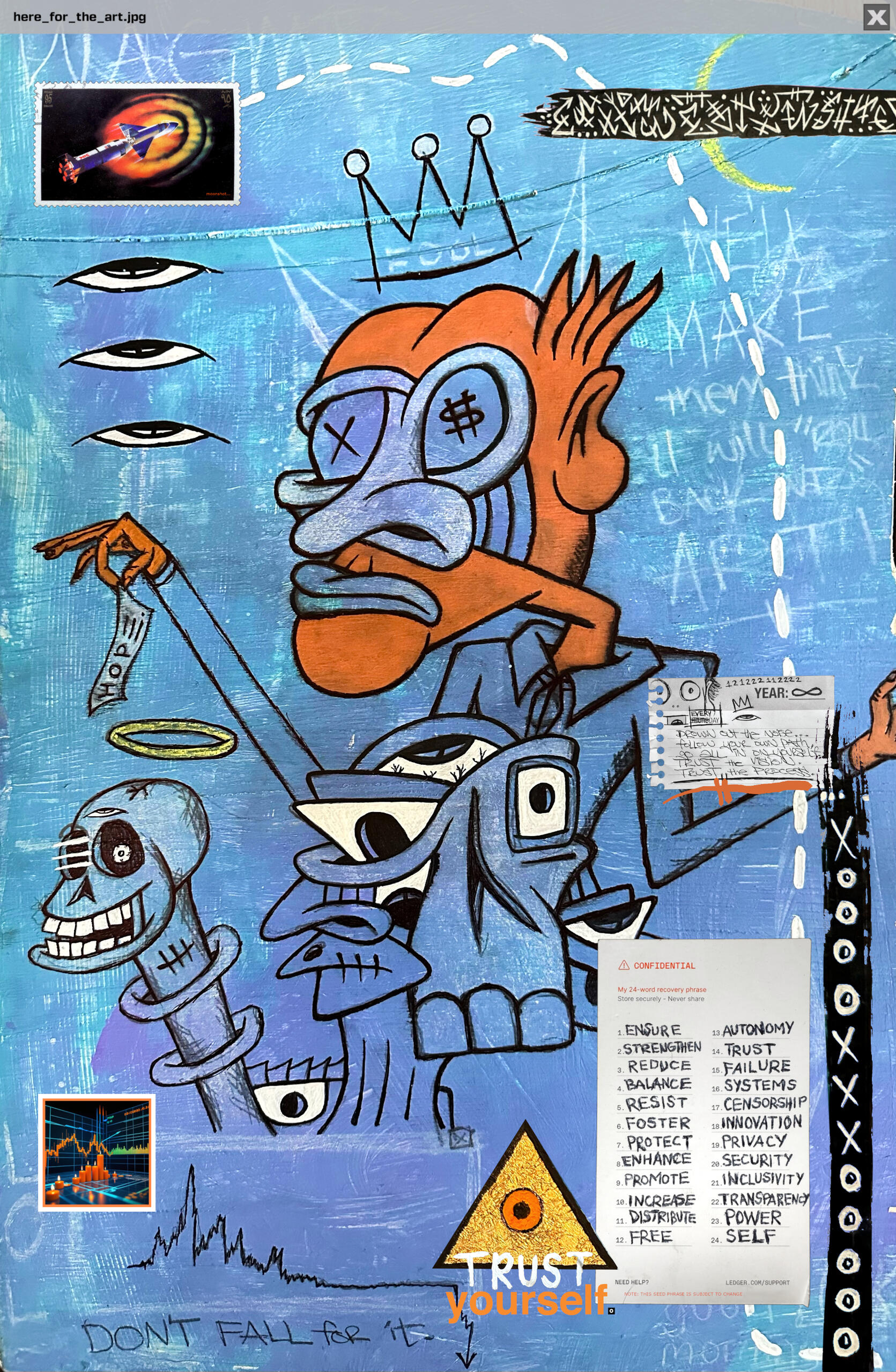 Manic Mondaze was the first acrylic painting that I minted on the blockchain. Painting has always been an outlet for me to express myself & my feelings/emotions.At the time I had been mainly focusing on digital illustrations & was missing the peace that comes with painting. This piece is the beginning of a shift towards primarily making acrylic paintings.acrylic on wood panel ~ 16.25” x 16.25”minted 5/9/22collector of token can claim physical painting. physical painting shows process video via AR