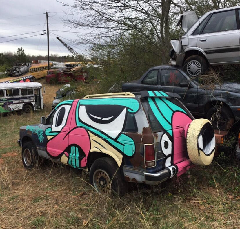 I spray painted this 4x4 at a place just north of Atlanta at a place called Schoolbus Graveyard.An artist friend of mine made friends with the owner of a junkyard and he started letting people come by and paint buses/cars.I painted there a few times and it was always a good time & a great spot to get some spraypainting in.