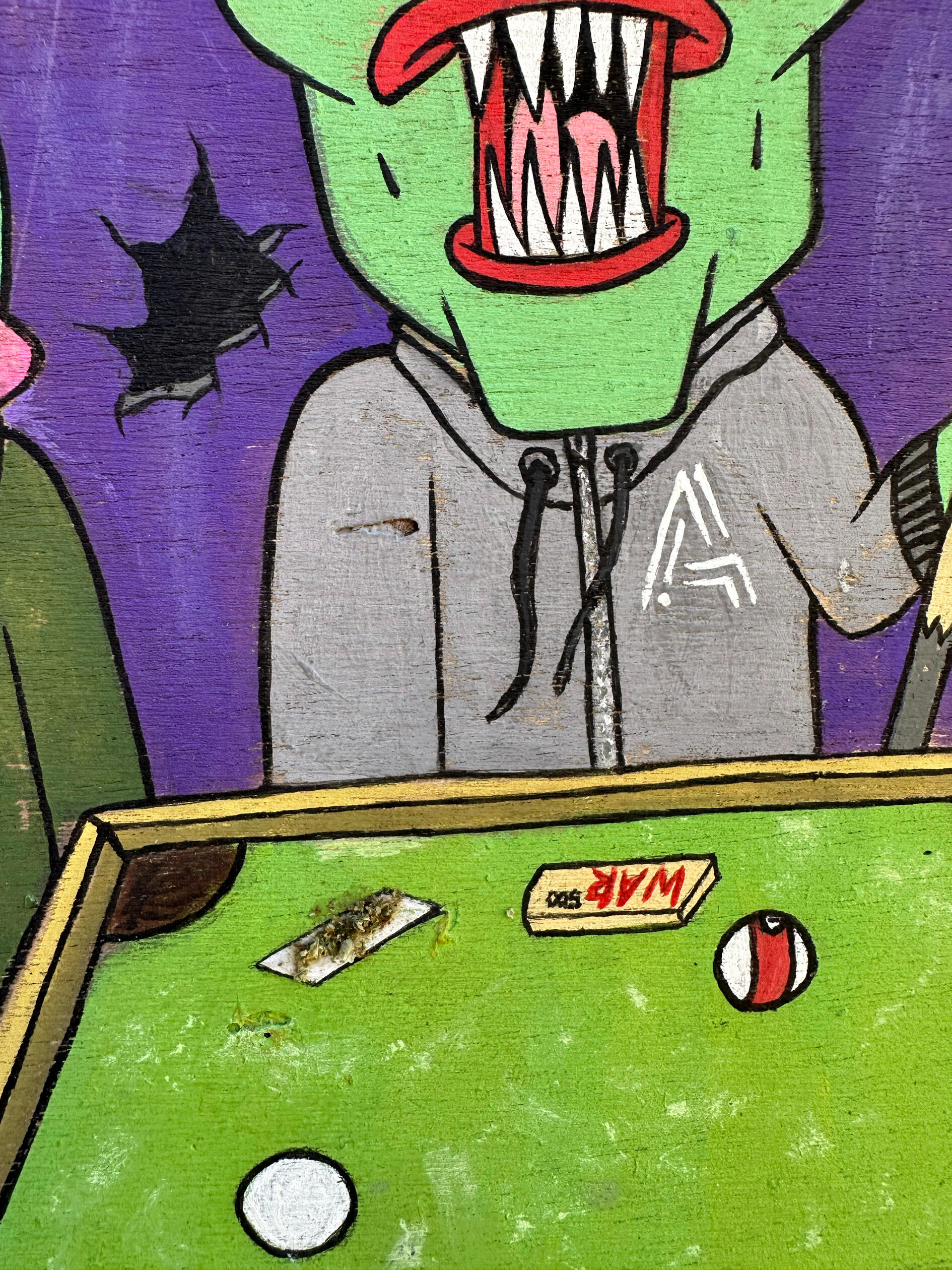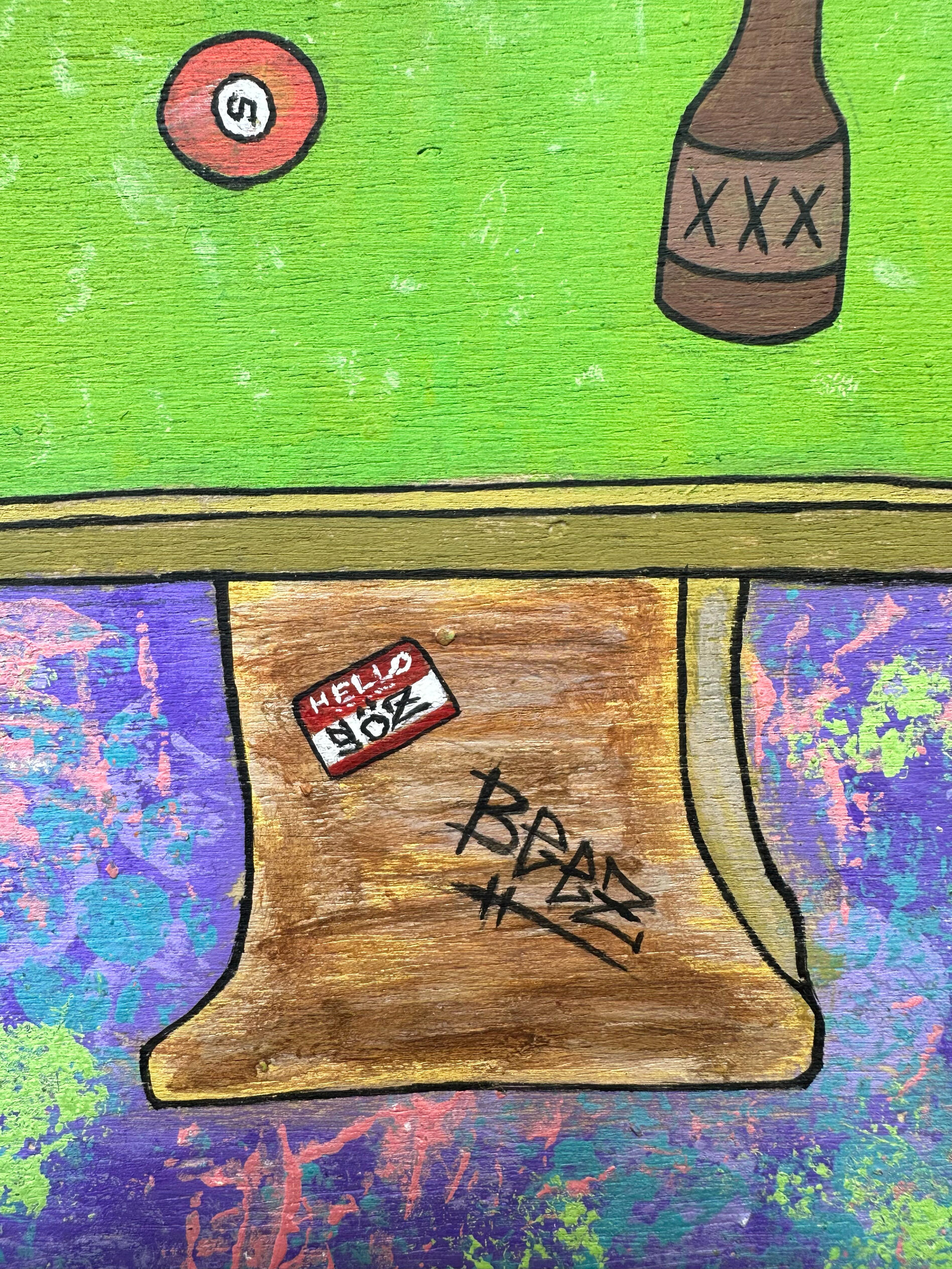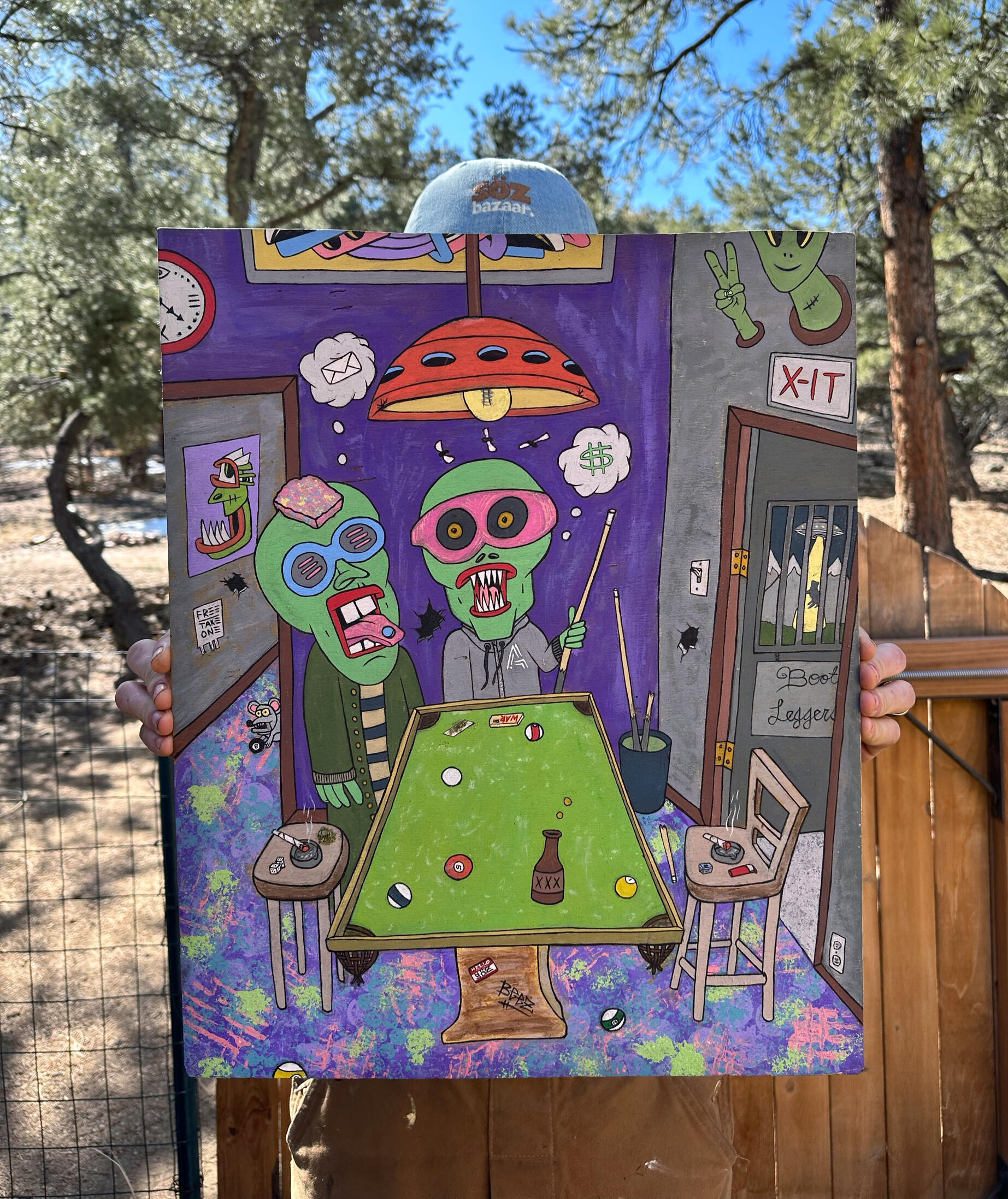 Schemes being plotted at a seedy bar in the mountains in the early hours of the morning.Acrylic paint & homegrown herbs on woodThis piece was made for an artist collective called Artillity. Each artist chose an NFT owned by punk2070 to recreate in their style.I chose XCOPY grifters and to push myself to create a full pool hall scene with lots of hidden details and my artwork on the walls.