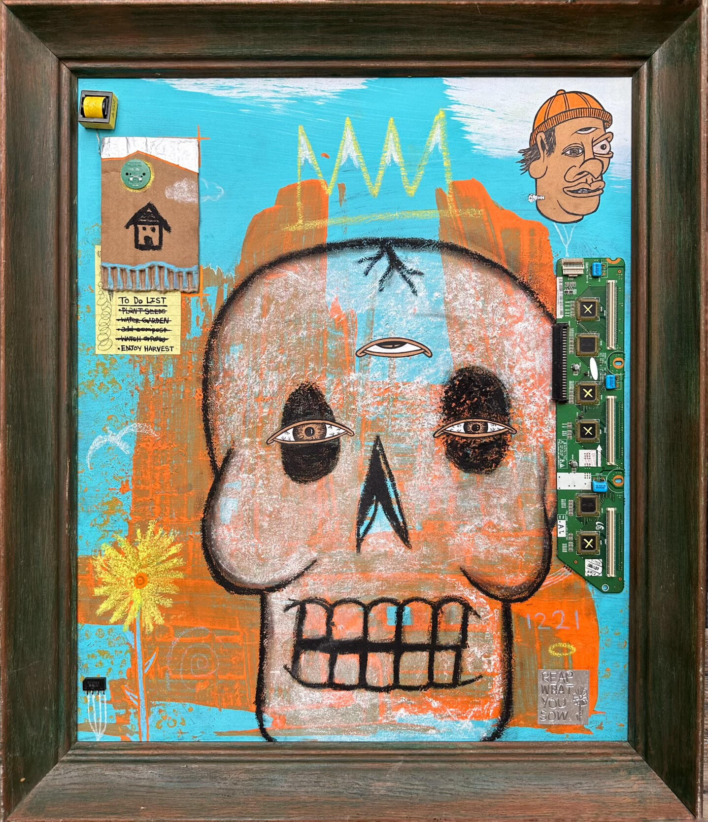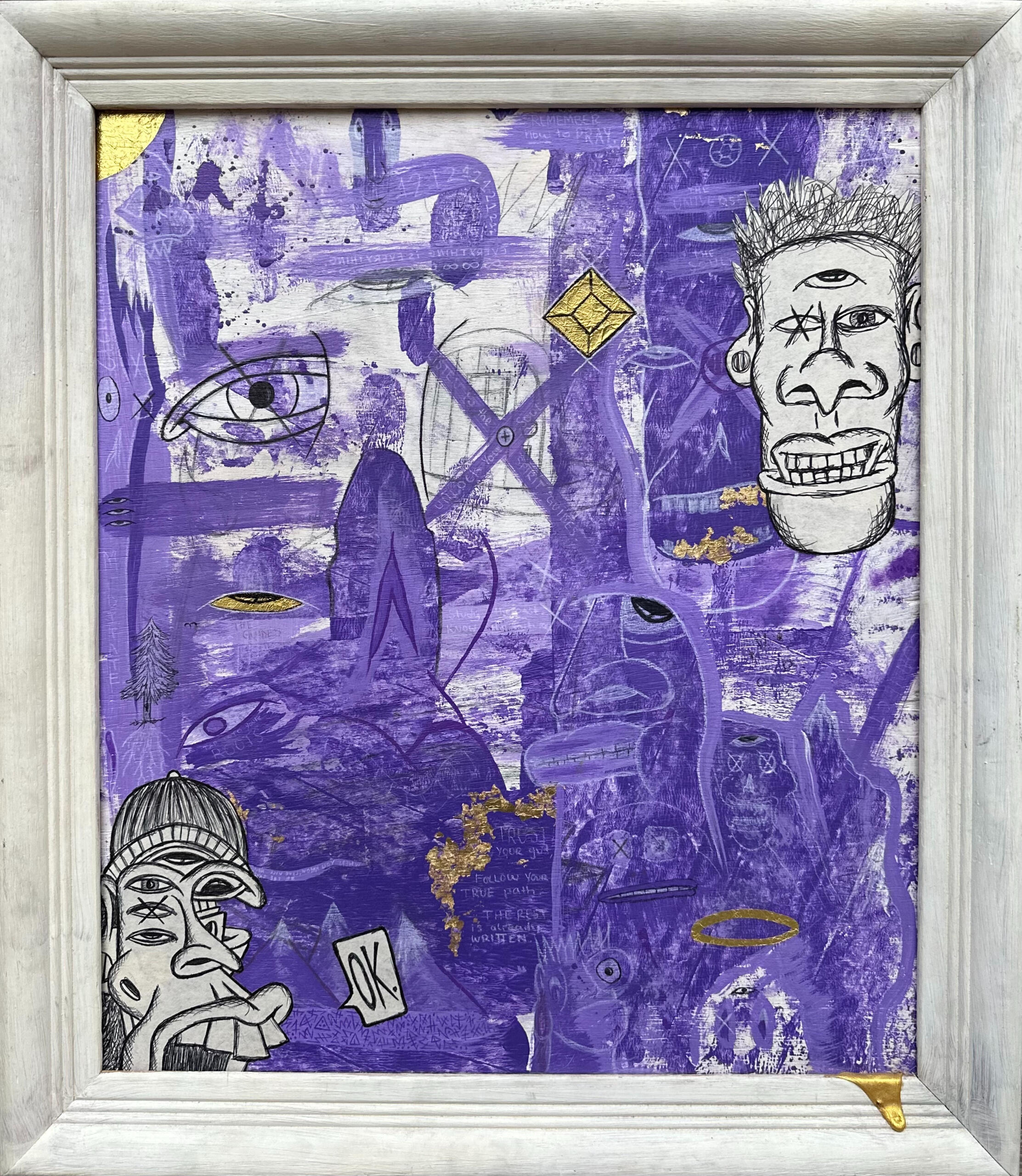 Indispensable Energy (2024)This is 1/30 mixed media paintings that were created for my first solo gallery show "Transmissions from the Ancient Past".It is also the first of my physical pieces to incorporate the Transient Labs T.R.A.C.E. chip. Incorporated into & linked with the physical piece is a scannable NFC chip that acts as a digital certificate of authenticity. I can also update the provenance of the piece in the event of showcases, sales, hidden messages etc.the soul is indispensable. it is energy that can't go nowhere. it may jump from vessel to vessel but it eternal. it may become trapped temporarily where it can remain dormant. live as true to your inner self as possible & it won't get stuck. using that energy to work towards what you know is right. this leads to your life working out exactly how you want it to and how it is meant to. put in the "work" & reap the harvest.Mixed Media on wood in upcycled frame.materials used: